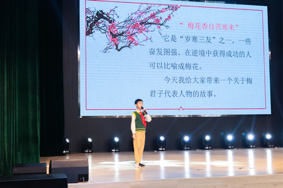 淡淡書香品人生, 四五六年級學生通過分享魯迅、文天祥、林徽因、王亞平等梅君子代表人物的故事,學習名人身上的優秀品質,在閱讀和分享中塑造“堅韌不拔、自強不息、嚴于律己、公平正義”的君子人格。