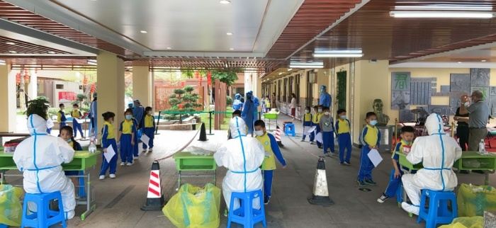 下午1點,經區防控指揮部通知,對火炬八小的教職工和學生入校開展全員核酸檢測。時間緊、任務重,火炬八小疫情防控領導小組迅速開展相關準備工作。下午2點30分,全員核酸檢測工作正式開始。師生每10人為一組依次配合醫護人員進行采樣。教師志愿者們穿著厚厚的防護服,或引導秩序,或掃碼核驗身份,確保核酸檢測工作的有序開展。在全校師生的極力配合下,火炬八小順利完成全員核酸檢測工作。