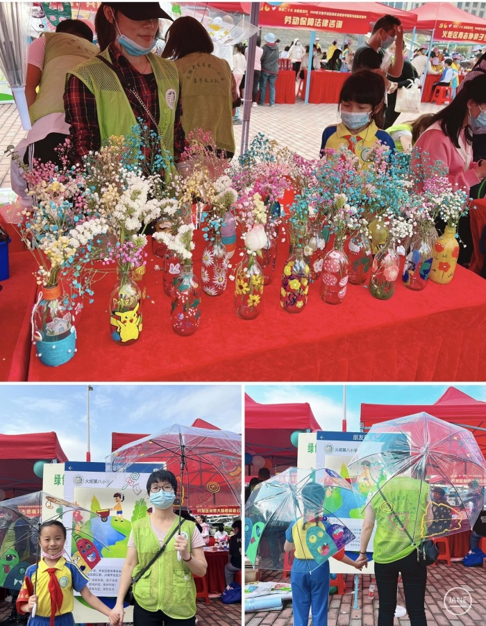 志愿者們還向市民群眾介紹了“變廢為寶”的意義,分享環保理念,并且展示用回收的廢棄玻璃瓶制作的花瓶、DIY環保雨傘、可回收紙藝花束等,讓市民群眾體會到廢物再利用的價值和好處,認識到生活中的廢棄物品不僅可以“變廢為寶”,還可以“變廢為美”。一點巧思、一份創意、一些實踐,只要我們有一顆踐行環保之心,就會創造出生活之美的新高度。