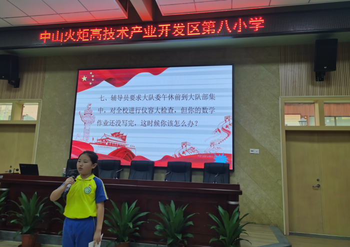 在活動(dòng)過(guò)程中,每一位候選人在精心準(zhǔn)備下隆重登場(chǎng),他們的競(jìng)選演講或激情昂揚(yáng),或字字鏗鏘,盡情抒發(fā)對(duì)少先隊(duì)大隊(duì)委職務(wù)的向往,表達(dá)了自己對(duì)服務(wù)學(xué)校、服務(wù)同學(xué)的強(qiáng)烈意愿。他們紛紛表示,加入大隊(duì)委后,將進(jìn)一步嚴(yán)于律己,處處做好先鋒榜樣作用,發(fā)揮組織才能,以充分的責(zé)任感參與到少先隊(duì)活動(dòng)中來(lái)。此次活動(dòng)最精彩的莫過(guò)于現(xiàn)場(chǎng)答辯環(huán)節(jié),此次答辯采取現(xiàn)場(chǎng)抽簽選題,題目圍繞大隊(duì)委日常工作中常遇到的困境或難點(diǎn),讓候選人現(xiàn)場(chǎng)限時(shí)作答,旨在考核他們的責(zé)任感、應(yīng)變能力及表達(dá)能力。這個(gè)環(huán)節(jié)充分引起了候選人及在場(chǎng)所有少先隊(duì)員代表們的興趣與思考,候選人精彩的回答也贏得了現(xiàn)場(chǎng)陣陣掌聲。