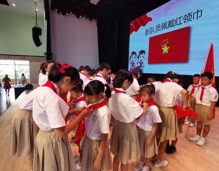 活動現場,二年級新隊員們戴上了期待已久的紅領巾,并在輔導員羅秋嬋老師的帶領下進行了莊嚴的宣誓和呼號,正式成為了一名少先隊員。董偉文副校長寄語新隊員們要勇敢地擔負起黨和人民的重托,把自己的理想和祖國、時代、人民聯系起來,立志終身學習,從小養成良好的道德品質,使自己成為新世紀祖國建設需要的棟梁之才。