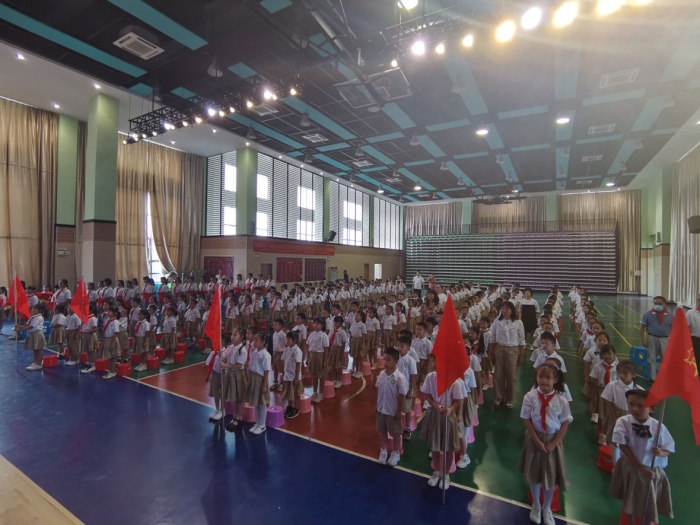 有一種顏色, 飄揚在心中永不褪色, 那是紅領巾的顏色;有一種驕傲, 令人激動不已, 那是戴上紅領巾的光榮。為熱烈慶祝中國少年先鋒隊建隊72周年,引導全校少先隊員聽黨話、跟黨走,切實增強少先隊員光榮感和組織歸屬感,賡續紅色血脈,傳承紅色基因,10月11日下午,火炬八小在體藝館舉行建隊72周年主題隊日活動暨入隊儀式。