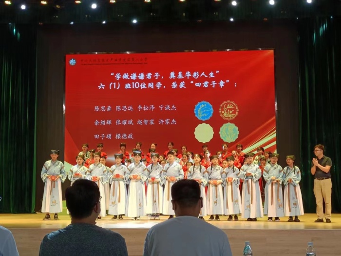 接下來,學校領導為畢業生頒發畢業證書并對優秀畢業生進行表彰,頒發最高榮譽“謙謙君子”章、“少年君子”章和“四君子”章,獎章熠熠,莊重熱烈,表彰激勵,催人奮進。每一位畢業生的臉龐都洋溢著幸福的微笑,為絢爛的小學生活畫上圓滿的句號。