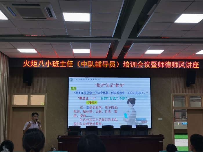 “師也者,教之以事而喻諸德也”,為加強(qiáng)班主任隊(duì)伍建設(shè),落實(shí)立德樹人根本任務(wù),建立良好的家校關(guān)系,家校共育,共促學(xué)生成長(zhǎng),火炬八小于8月28日下午在報(bào)告廳開展德育專題講座暨班主任(中隊(duì)輔導(dǎo)員)培訓(xùn)會(huì)議。本次會(huì)議由學(xué)生服務(wù)室鄧龍主任主持,特邀請(qǐng)了中山市優(yōu)秀德育干部、中山市班主任專業(yè)發(fā)展研究中心成員、中山市家校共育研究中心講師團(tuán)副團(tuán)長(zhǎng)、火炬區(qū)第四小學(xué)楊勇強(qiáng)副校長(zhǎng)為全體班主任和新教師開展講座。