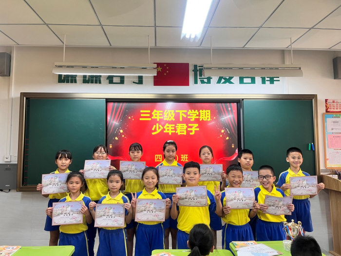 經過了一學期的努力,不少同學成功獲得了“少年君子”稱號。在直播中,鄧主任宣布了火炬八小第四批“少年君子”獎章獲得者的名單,并向他們表示祝賀,希望他們繼續努力,展現少先隊員積極向上的精神風貌,在學校各項活動中繼續發揮模范帶頭作用。小小獎章匯聚大大的能量,此次表彰大會為少先隊員們樹立了榜樣。在黨的帶領下,在星星火炬的照耀下,在紅領巾獎章的激勵下,火炬八小全體少先隊員將努力培養君子品格,學做謙謙君子,立志向、修品行、練本領,爭做新時代好隊員,努力為實現中華民族偉大復興的中國夢時刻準備著!