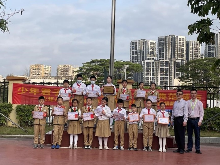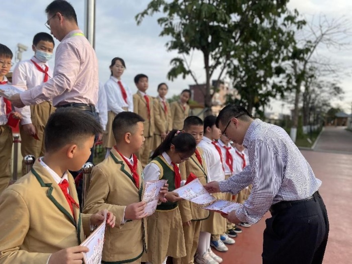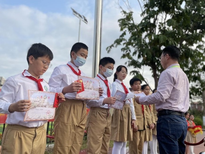 萬校長激情昂揚的致辭結束后,“童心向黨,爭章逐夢”紅領巾獎章頒章儀式正式開始。學校大隊輔導員羅秋嬋老師宣布獲得“紅領巾獎章”的少先隊員名單,授予宋玉琳等兩名少先隊員2021-2022學年“紅領巾獎章”個人四星章;授予黃伊樂等少先隊員2021-2022學年“紅領巾獎章”個人三星章,由萬小兵校長和鄧龍副校長現場為他們頒發獎章。