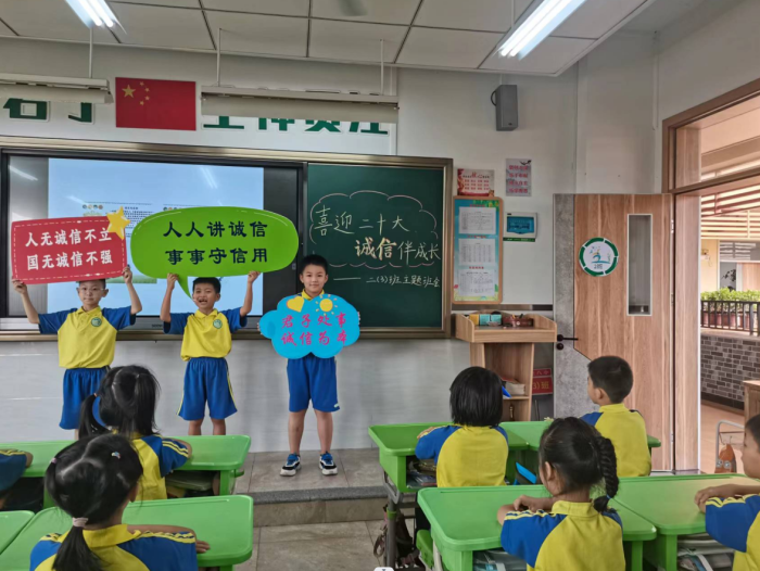 君子立言,一諾千金;君子處事,誠信為本。誠信是中華民族優秀傳統美德,是做人立身立德之根本。為弘揚誠信立德之風,營造“做誠信人、說誠信話、做誠信事”的校園氛圍,根據中山市教育和體育局關于開展“誠信宣傳進校園”活動的要求,結合八小“君子文化”辦學特色,火炬開發區第八小學于9月23日開展“喜迎二十大 誠信伴成長——誠信宣傳進校園”教育活動,教育學生做到知行合一,使誠信觀念扎根校園,深入人心,以實際行動迎接黨的二十大勝利召開。