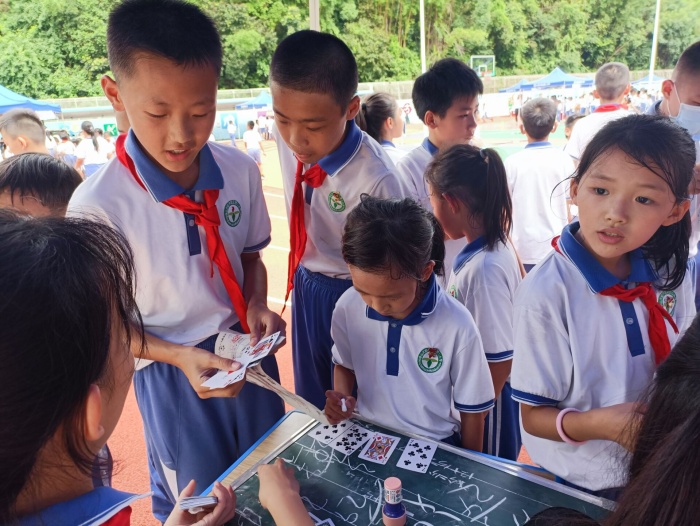 數學團隊的老師們除了傳授數學知識,還會為學生提供鍛煉數學思維和提高數學綜合能力的平臺,激勵孩子們積極主動地遨游數學王國、探索數學奧秘。其中,數學嘉年華活動便是一個“玩轉”數學的大舞臺,也是一年中孩子們最熱烈追捧的活動之一。老師們精心策劃,認真積極籌備,各式各樣的數學游戲攤位拔地而起,“24點對抗賽、數獨合作、數學燈謎、數字華容道、數30、數字行棋……”攤位前,人潮洶涌,孩子們有序地排隊、焦急地等待、熱情地參與,活動場面熱鬧非凡。活動中,學生們深刻體會到數學學習不僅發生在課堂上,更存在于課堂之外,在生活的方方面面中。