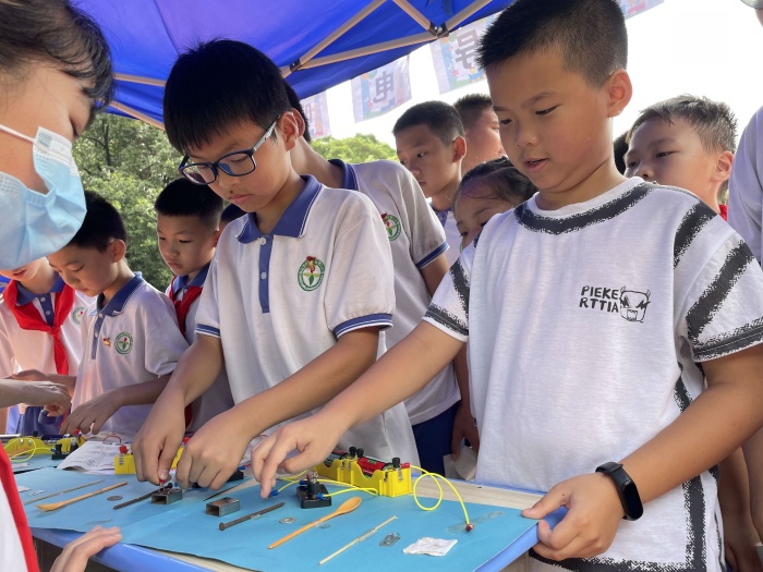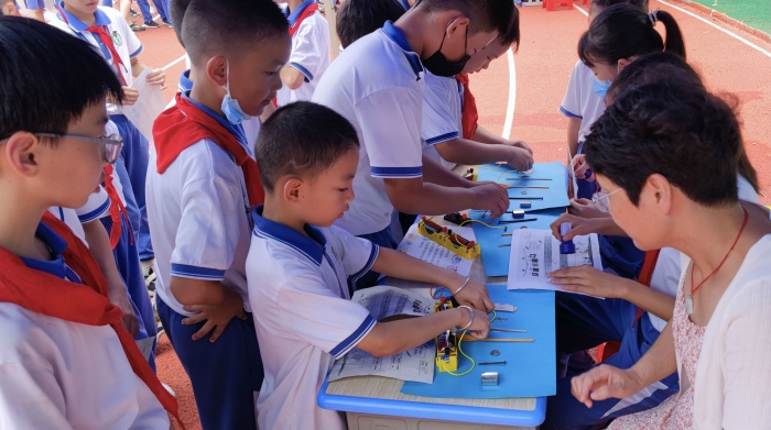 科學體驗活動則在5月31日下午開展,全校1332名學生參與到本次活動當中。活動現場設置了一系列蘊含科學知識的趣味活動,“穿越火線、點亮小燈泡、觀察動植物細胞、它能導電嗎、滑翔機大比拼……”學生們沉浸于科學體驗活動的同時,也收獲了許多的科學小知識,活動場上縈繞著孩子們的歡聲笑語。