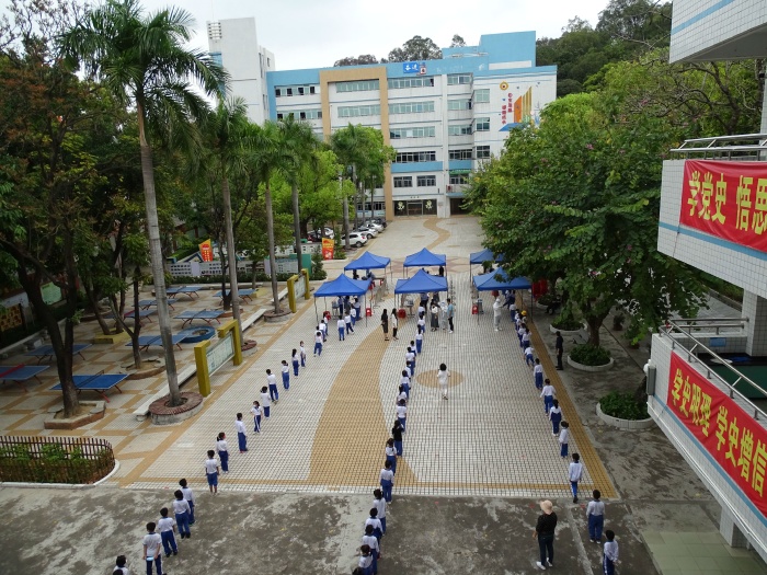 14:00,醫護人員進入校園,學校派出6名志愿者協助核酸檢測。在正副班主任的組織和帶領下,學生依序排隊,十人一組,分批進場核酸檢測區域登記信息。信息核對無誤后,醫務人員進行采樣,完成采樣的學生在老師的指引下有序返回教室。歷時兩個半小時,全校1400多人全員完成核酸檢測。整個檢測過程有條不紊,秩序井然。