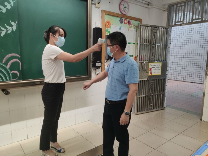 在上班時(shí)間,突發(fā)咳嗽并伴有發(fā)熱癥狀的老師立刻前往衛(wèi)生室。校醫(yī)對(duì)老師進(jìn)行近14天旅居史調(diào)查詢問、體溫復(fù)測(cè)和初步診斷,做好記錄后,立即上報(bào)學(xué)校總指揮進(jìn)行應(yīng)急處理,并通知其家人或配合120將其送到定點(diǎn)發(fā)熱門診及時(shí)就診,同步立即上報(bào)到社區(qū)、區(qū)教育事務(wù)指導(dǎo)中心等相關(guān)部門。