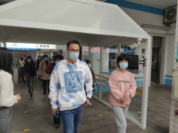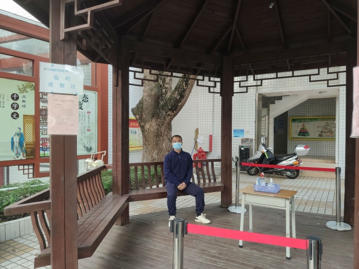 演練前,朱亮副主任詳細講解了每一個情景環節的具體操作流程,真正讓演練成為學校抗“疫”的硬核力量。演練中,“同學們”在校門口每人間隔一米有序排隊,逐個進行入校體溫檢測。由值日行政、值日教師和值班保安組成護導隊,提醒學生保持安全距離,并對學生的體溫進行測量、登記。體溫異常學生在值日教師的帶領下前往健康觀察區。隨即,校醫對學生進行詢問、體溫復測和初步診斷,做好記錄后通知家長,由家長按要求及時把學生送到定點醫院并按照醫療機構指引處理。