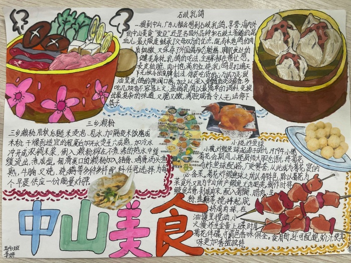 為了幫助同學們更好地了解中山傳統文化,感受經典美食的魅力,本次讀書節的第一項閱讀實踐活動就是讓學生尋找自己喜愛的中山傳統美食,并以圖文并茂的手抄報形式展示。此項活動既增長了學生知識,又鍛煉了學生的動手能力,還培養了他們的審美水平。此外,通過閱讀、搜集相關材料,讓學生在實踐活動中,進一步了解中山傳統美食的制作方法和美食背后的歷史故事,懂得珍惜勞動成果,弘揚中山傳統美食文化。
