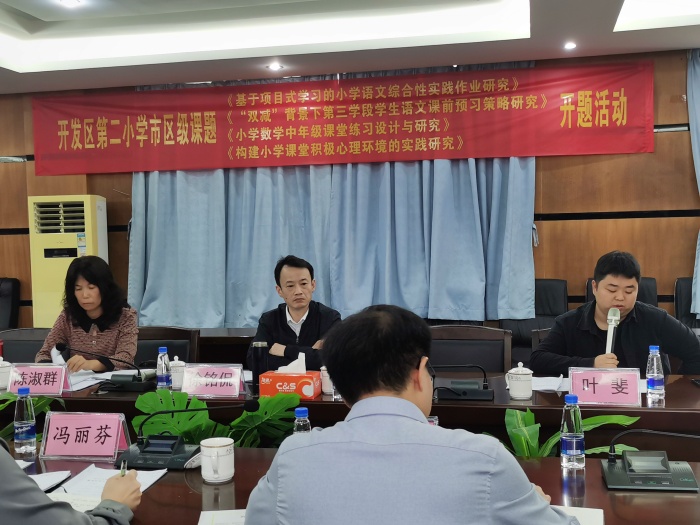 學校為了能夠使立項課題更有效地開展,提高課題研究的質量,特邀請了市實驗小學正高級教師徐銘侃校長、陳淑群德育主任以及開發區教育事務指導中心教研員劉剛毅校長、葉斐老師出席本次活動。開發區第二小學馮麗芬校長、兩個課題組的成員和部分老師也參加了本次開題活動。
