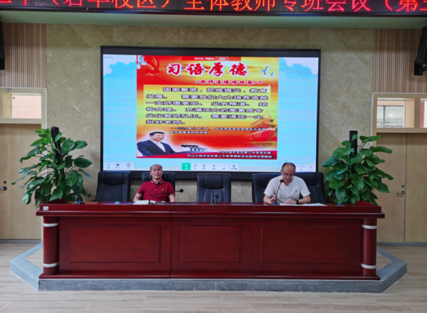 4點30分,待到學生安全有序的離校后,火炬二中全體教職工在會議室進行了教育教學專班會議,由教務(wù)主任林建主持。林建主任首先帶領(lǐng)大家進行習語厚德的學習,在會議上大家共同學習了習近平總書記向全國廣大教師致慰問信里的一句話:“教師是立教之本、興教之源,承擔著讓每個孩子健康成長、辦好人民滿意教育的重任?!彼笕w教師要“不忘初心、牢記使命”,在疫情的特殊時期,要將“教書”和“育人”兩項工作有機統(tǒng)一結(jié)合起來,不僅要做好“教書”的本職工作,也要充分地關(guān)注學生的心理健康情況,努力讓學生健康的學習、開心的學習。辦好社會、家長、學生都滿意的教育。接著他對本周學校的師生出勤情況和教師網(wǎng)格化值日情況進行了總結(jié),他強調(diào)我們的老師按時到崗,責任心強,工作認真,值得表揚。但我們?nèi)匀灰逦恼J識到在抗疫的特殊時期,防疫工作與學生心理健康工作仍是重中之重,萬萬不能掉以輕心。