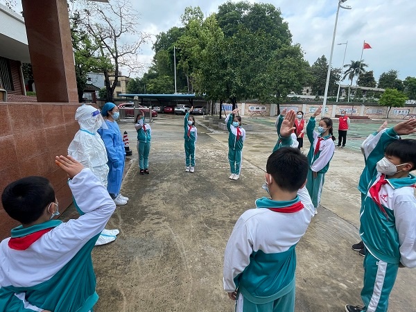 在醫務人員整理好核酸樣本后,校少先隊員代表們用手語舞向醫務人員表達感謝?!搬t生姐姐,雖然我們看不到你的樣子,但你一定很美,我們為你唱首歌吧!”隊員們邊舞邊唱:送給你小心心,送你花一朵,你在我生命中,太多的感動……隊員們用可愛又溫情的表演,傳遞著對醫護人員的感激之情,這段手語舞表演讓醫護人員備受感動。表演完畢后,隊員們用最標準、最神圣的隊禮,向醫護人員致以最崇高的敬意!