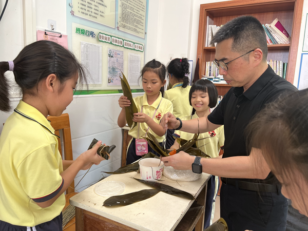 “五月五,過端午”一二年級老師通過詩詞追溯端午節的由來,講述屈原、伍子胥的故事,讓學生了解到端午節更是一個愛國節。長廊、教室飄出了陣陣粽香和笑聲,三四年級的學生在老師、校外輔導員的指導下,認識了粽葉、糯米等制作粽子的原材料,他們學著大人的樣子卷粽葉、填糯米、扎粽繩……小心翼翼、認認真真包粽子。而校園的另一個角落卻豐常安靜,學生聚精會神拿著畫筆,用五彩的顏料繪畫出一條條長龍,一個個會笑會說話的粽子。一幅幅圖畫講述著傳統節日“端午”的習俗。