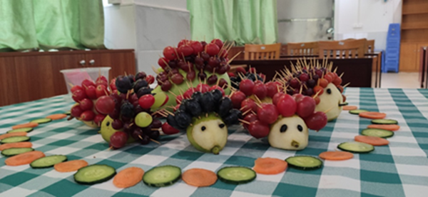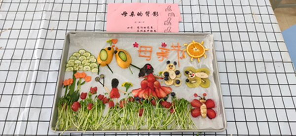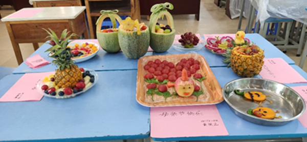 面對琳瑯滿目、五彩繽紛的新鮮蔬果,心靈手巧的同學們可謂胸有成竹,你剝他切,我掰他刻,個個全神投入。一陣陣歡聲笑語后,作品漸漸出爐,同學們呈現出來的作品可謂匠心獨運,讓人大飽眼福,花朵娃娃笑逐顏開、小雞刺猬形態神似,每個拼盤都細致精巧,美不勝收。