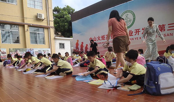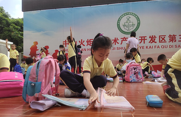 2022年5月9日,三小的“快樂大課間”勞動技能比賽在鳳凰臺開始了。一年級的比賽項目是整理書包。隨著老師的一聲令下,孩子們將被評委老師打亂順序的一本本書、作業本、文具等按照一定的順序整理好裝進書包。比賽過程中孩子們積極參與,熱情高漲,他們有的是按照順序先整理好然后再一起裝進書包,有的是一本一本的放進書包,雖然稍慢一點,但也能在規定的時間里把書包整理整齊,拉好拉鏈,背在肩上。