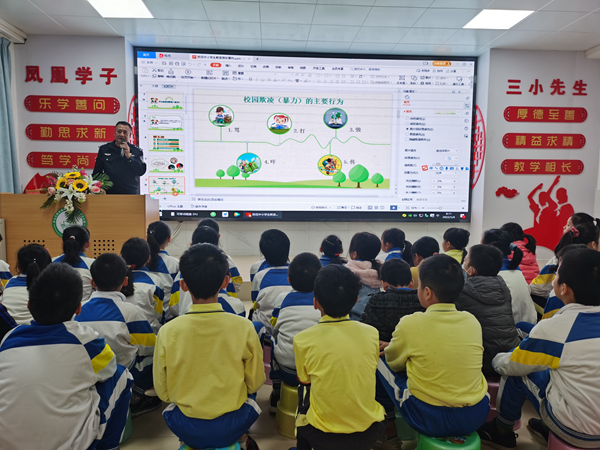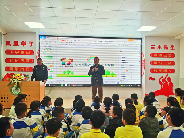 為全面落實(shí)國(guó)務(wù)院教育督導(dǎo)委員會(huì)辦公室《關(guān)于開(kāi)展校園欺凌專項(xiàng)治理的通知》和廣東省教育廳《廣東省教育廳等十三部門關(guān)于加強(qiáng)中小學(xué)生欺凌綜合治理方案的實(shí)施辦法(試行)》的文件精神,預(yù)防和杜絕小學(xué)生校園欺凌,增強(qiáng)學(xué)生法律意識(shí),規(guī)范學(xué)生行為,促進(jìn)學(xué)生身心健康。火炬開(kāi)發(fā)區(qū)第三小學(xué)于2022年1月4日早上,利用晨會(huì)的時(shí)間,特邀三小法制輔導(dǎo)員、濠頭派出所劉建國(guó)警官到校為學(xué)生進(jìn)行預(yù)防校園欺凌專題教育活動(dòng)。
