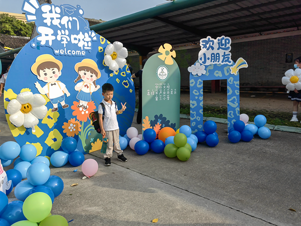 校園內,老師們把校園裝扮一新,還精心準備了“歡迎新小朋友”“新學期新起點”等各種展板,供新生們打卡合照。不到八點,一年級的萌娃們就陸續來到學校,家長們牽著孩子的手,有序掃碼、排隊步入校園,校長送上祝福,歡迎每一位前來報到的新生。