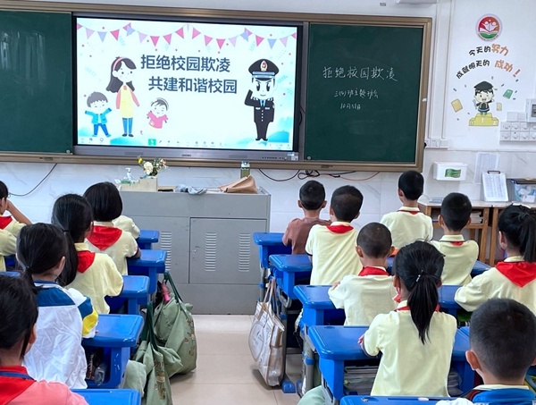 活動中,老師們分別從什么是校園欺凌、校園欺凌的類型、校園欺凌的角色和危害、如何遠離校園欺凌四個方面深度解析校園欺凌,向學生們講解、普及相關知識。通過展示調查數據、講解新聞報道以及組織觀看視頻等方式,讓同學們明白,一旦遇到校園欺凌,要第一時間向老師和家長反映,絕不能忍氣吞聲,要敢于拿起法律的武器保護自己,堅決向校園欺凌說“不”。還要提高自身安全防范意識,有矛盾及時尋求老師幫助化解,上放學盡可能結伴而行,不和不法人員去偏僻的地方,面對可能發生的不法侵害時要在確保人身安全的前提下,盡快脫離危險環境,第一時間尋求學?;蚓降谋Wo。