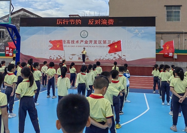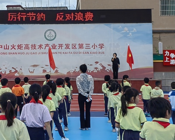 2022年10月17日,三小在國旗下講話中,由少先隊員代表宣讀"厲行節約,反對浪費,做新時代好少年"倡議書,激勵全體同學從身邊小事做起,養成勤儉節約的好習慣,爭做新時代好少年。德育處藍佩賢主任也呼吁全體師生樹立節約意識,以節約為榮,浪費為恥,弘揚勤儉節約的傳統美德,樹立愛糧節糧的新風尚,為創建文明校園貢獻力量。