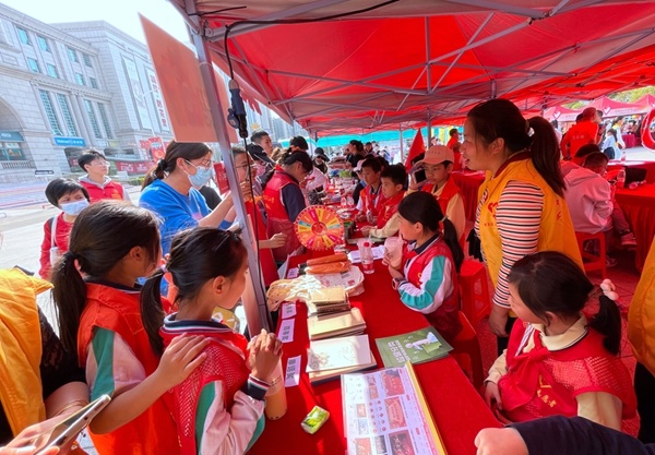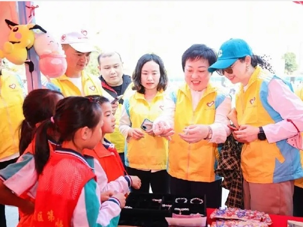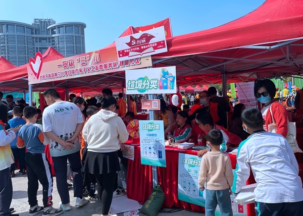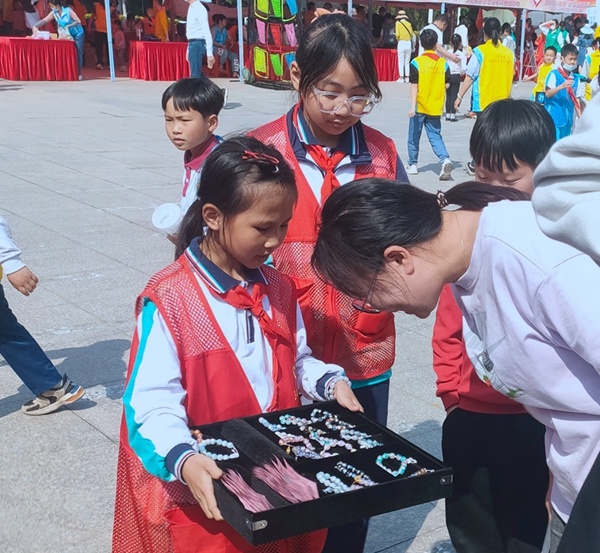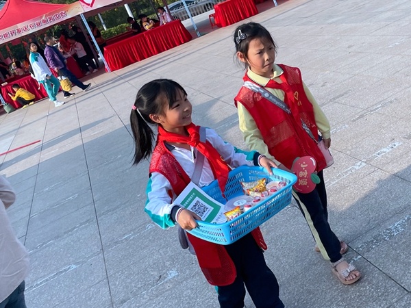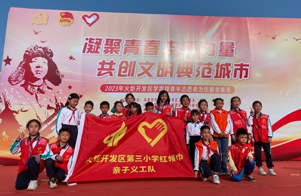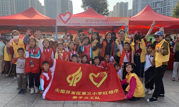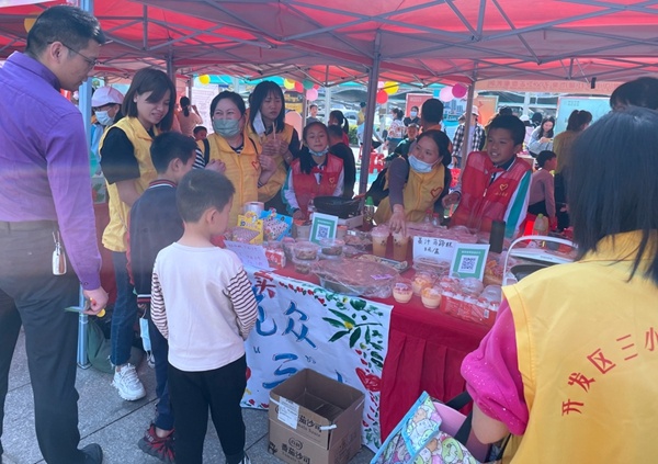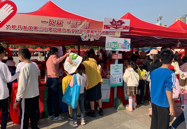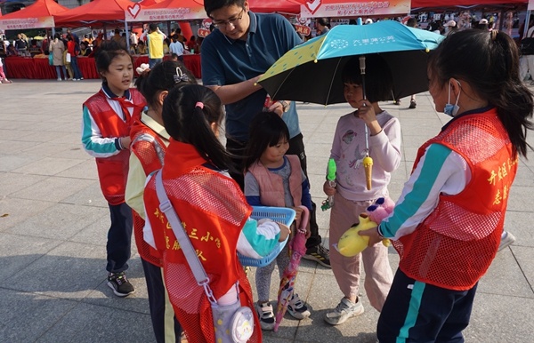 當天下午,太陽城廣場舉行的志愿者服務集市活動像當空的驕陽,如火如荼、熱鬧非凡。火炬三小親子義工隊的一覽眾“三”小義賣攤位和紅領巾宣講攤位上,站滿了大大小小的志愿者,紅紅的桌布上放著琳瑯滿目的活動物品。
