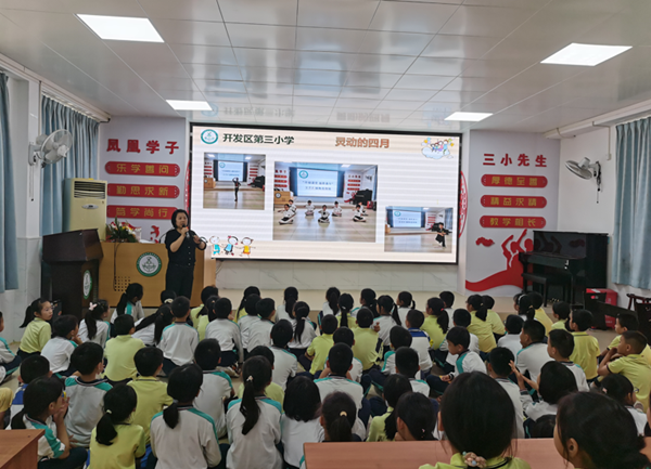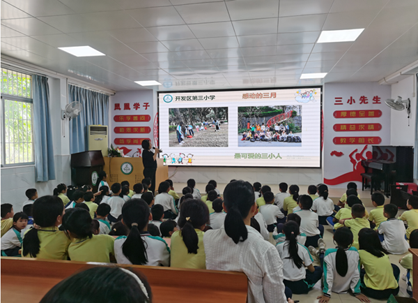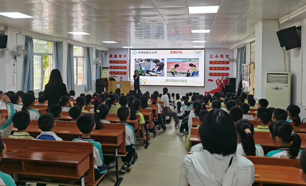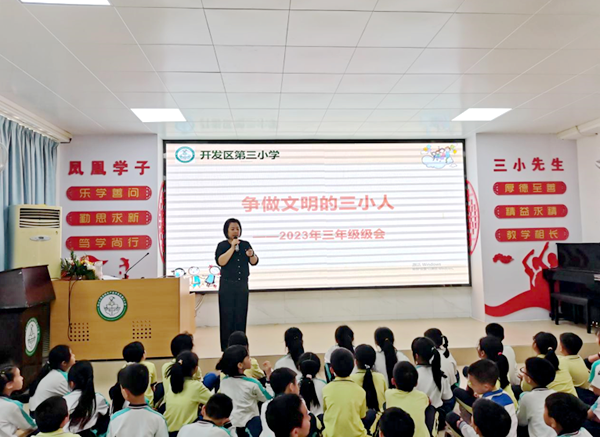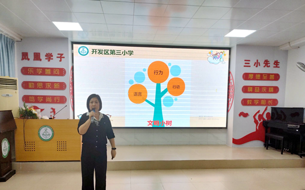 本次會議由三小德育處藍佩賢主任主持,她先出示一棵文明小樹,以生動的語言,結合日常在校的生活例子給同學們上了一節生動形象的課。她從語言、行為、行動三方面教育同學們如何做到文明有禮,同時指出同學們存在的不文明行為,指導同學們如何改正。
