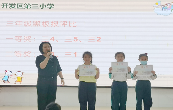 最后,藍佩賢主任對本學期開展的運動會、學雷鋒活動、防震演練、藝術節海選等活動進行總結,肯定同學們開學以來的表現,并給板報評比、班級文化評比、“紅領巾獎章”爭章活動獲獎班級和個人頒發了獎狀,獲獎的同學和班級都開心不已,臺下響起雷鳴般的掌聲。