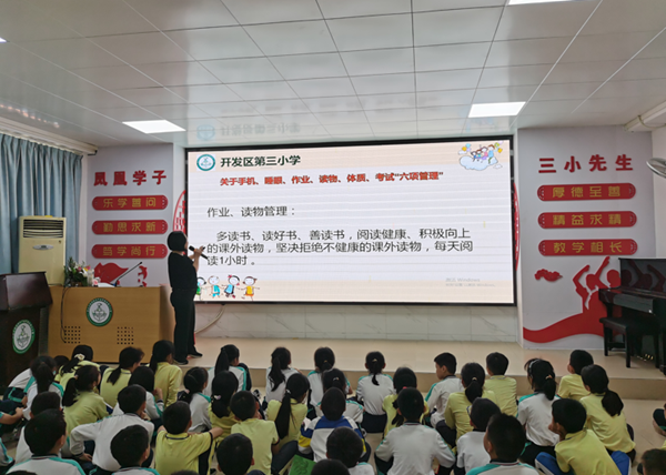 為了落實”雙減“的相關政策,藍主任和同學們一起學習了關于手機、睡眠、作業、讀物、體質、考試的“六項管理“制度。