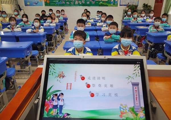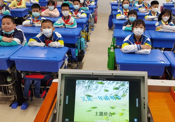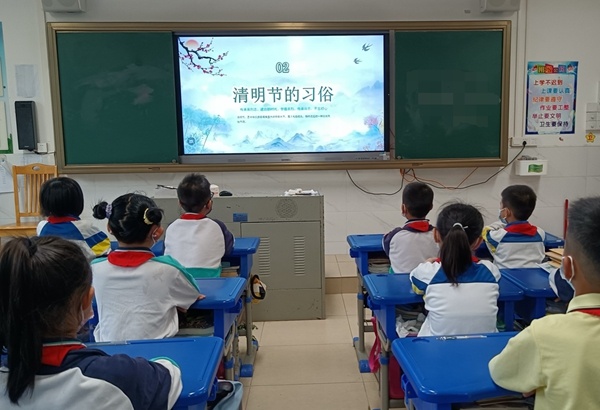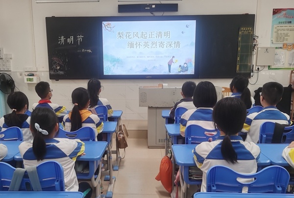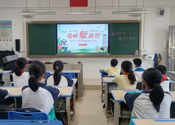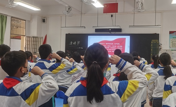 活動中,班主任通過介紹清明節的來歷、清明節的習俗引入主題,講述典型英雄的故事、詩詞朗誦等,深情緬懷烈士,寄托無盡的哀思,希望同學們懂得珍惜革命烈士用自己的鮮血換來的幸福生活。作為少先隊員,一定不辜負烈士們的遺愿,踏著烈士們的足跡奮勇向前。還勉勵同學們要奮發向上,學好知識和本領,培養良好品格,樹立報國的信念和決心。最后,同學們在教室的國旗下宣誓:人民為先,祖國至上,誠實勇敢,自律自強;努力學習,奮發向上;振興中華,再造輝煌。