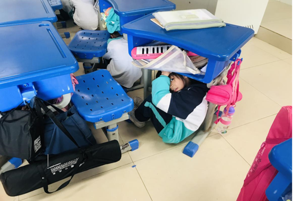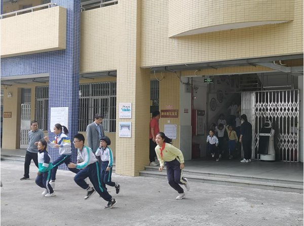 演練中,第一遍警報響起,各樓層的安全員迅速到位,各班班主任迅速組織學生,迅速躲到課桌下面,或拿書包等保護物品遮住頭部和頸部。第二遍警報響起,各班主任在黨員楊勇強校長的指揮下,迅速組織學生有序地按照規定逃生路線向外撤離疏散。撤離的過程中,學生保持著雙手護頭的姿勢,安靜有序地沖出教室。來到操場后,學生聽從指揮原地蹲在各班集合的地點,仍然保持雙手護頭的姿態,班主任則迅速清點人數,確保不漏一人。