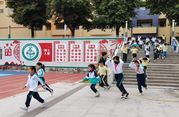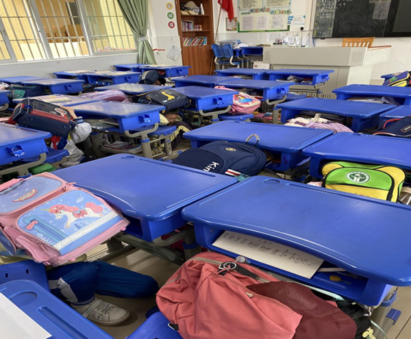 16:00,伴隨著地震警報的長鳴聲,演練開始了。各班班主任迅速指導學生進行教室內應急避險。只見同學們立刻拿起課本或書包護住頭,躲到課桌下、墻角等地方。隨后,地震警報解除,應急疏散警報信號發出。班主任指導學生按預設安全逃生路線迅速、有序撤離,按要求來到空曠的運動場,整個防震疏散活逃過程緊張而有序。