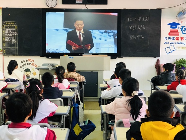 12月3日上午9點(diǎn)左右,全體師生參加了第八屆國(guó)家憲法日“憲法晨讀”活動(dòng)。在活動(dòng)中,大家通過教育部全國(guó)青少年普法網(wǎng)收看網(wǎng)絡(luò)直播,同步跟讀憲法晨讀內(nèi)容、跟唱歌曲《憲法伴我們成長(zhǎng)》、認(rèn)真傾聽優(yōu)秀學(xué)生進(jìn)行展演等。其中七歲女孩以光頭強(qiáng)的故事來講憲法知識(shí),通俗易懂,引起學(xué)生對(duì)憲法學(xué)習(xí)的極大興趣。