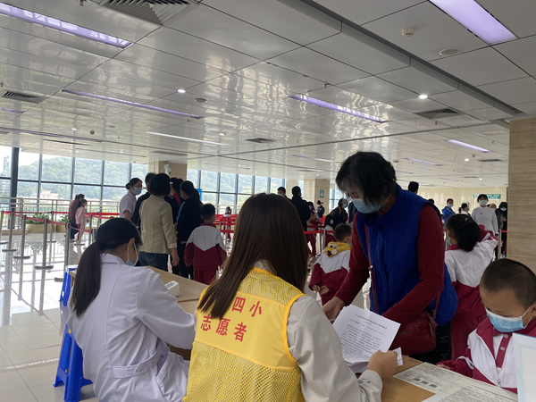 當天8點左右,火炬區第四小學黨員、教師紛紛華麗“變身”,參與疫苗接種現場維持秩序,引導并協助家長、學生進行疫苗接種活動。有的在現場組織排隊、有的引導家長填表登記,有的負責資料信息核查,有的配合醫務人員做好孩子的心理疏導工作現場井然有序。面對個別學生對于打針的抵觸心理,火炬區第四小學的志愿者們用自己的耐心和安慰,給予了孩子們直面恐懼的勇氣,順利完成疫苗接種工作。