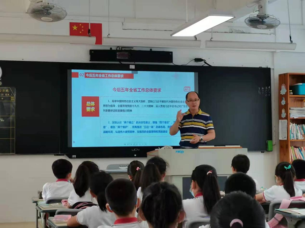 6月23日下午,教務處主任謝奕新在五(4)班開展省第十三代黨代會精神專題宣講。在專題學習宣傳過程中,謝主任從學校教學設施環境出發,向學生簡要講解省五年來的主要成就。帶領學生一起學習了過去五年的歷史性成就和彌足珍貴的經驗及今后五年的奮斗目標和重點任務。學生在感受省飛速發展變化的同時,引導廣大青少年兒童勤學習、樹理想、煉意志、強體魄、愛勞動,牢記領袖囑托、牢記初心使命,發揮當代青年群體的力量,在奮力開創新的“黃金十年”偉大征程中努力成長為新的“黃金一代”,讓黨的事業薪火相傳、紅色江山后繼有人!