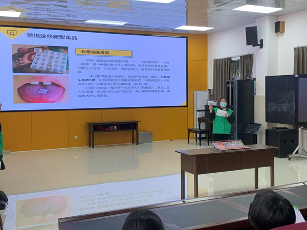 禁毒辦工作人員向同學們派發禁毒宣傳單,并介紹了“什么是新型毒品、常見的新型毒品類型、吸毒的巨大危害、如何防范毒品”。在通俗易懂的語言、各種真實的案例中,同學們感受到毒品的危害,他們認真聽講、積極參與互動交流。