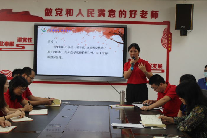 實地演練結束后,全體教師集中會議室,由校長胡冬梅親自抽查,以把控演練效果。除了抽查常見的防疫問題如何處理外,學校還根據當前疫情的特點,把“封控區”“封閉區”“次密接觸者”等新的概念放入情境中,讓老師們在場景案例演練中去思辨、探討,進而獲得新知。健康副校長霍醫生和分管學校防疫工作的行政曹怡老師分別傳達了上級防疫政策,并就演練中出現的個別問題提出建議。