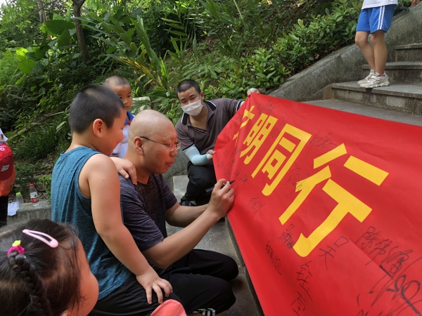 活動當天,第五小學親子義工隊的志愿者們頂著高溫,早早來到了活動現場。活動伊始,親子義工隊負責人阮結連老師就本次活動的意義、活動安排、活動注意事項等事宜進行講解,對小隊員們進行創文知識的宣傳培訓。準備工作就緒后,親子義工隊的小隊員們在爸爸媽媽的帶領下對公園內的群眾開展創文宣傳、普及文明創建知識,旨在提高市民群眾對創文的參與率、知曉率。雖然親子義工隊的隊員們年紀小小,但卻表現出創文小主人翁的意識,主動向群眾普及創文知識。群眾自覺在橫幅上簽署名字,承諾做文明的火炬人,為創建文明城市出一份力量。在宣傳活動的同時,成員們還“小手拉大手”對公園內外衛生死角進行垃圾清除。雖然天氣炎熱,卻絲毫沒有阻擋第五小學親子隊成員們的熱情,他們身體力行積極參與創文工作,建設美麗火炬區。