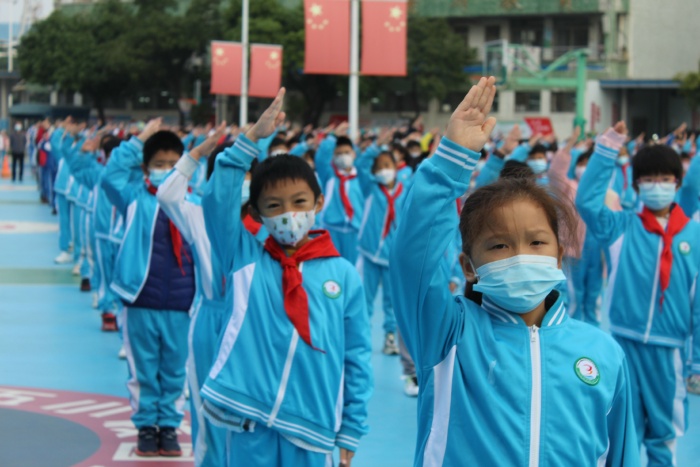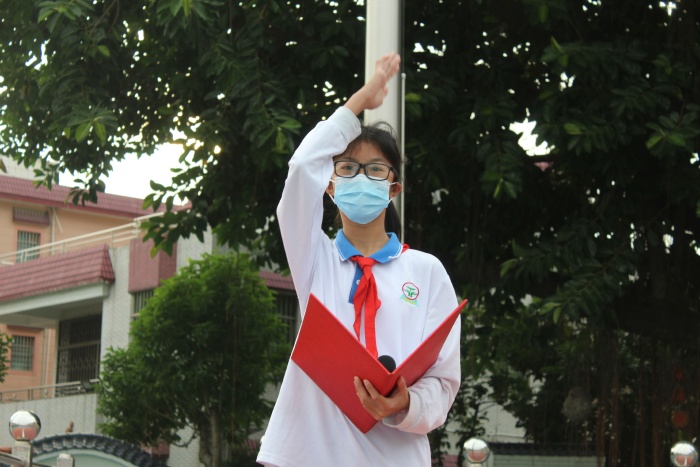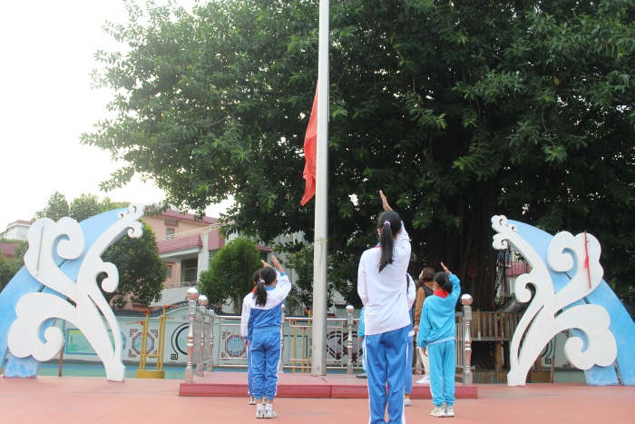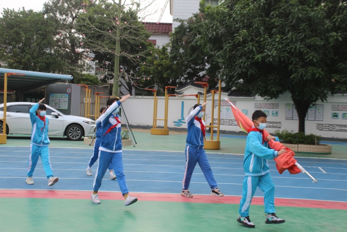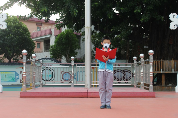 升旗儀式于7:50準時開始。雄壯有力的《義勇軍進行曲》響徹了整個校園,全體教師行注目禮、少先隊員行隊禮,全場彌漫著一種莊嚴肅穆的氣氛。升旗禮畢,在莊嚴的國旗下,四5中隊的隊員代表馮子明作了《牢記歷史 勿忘國恥 振興中華》的國旗下講話。