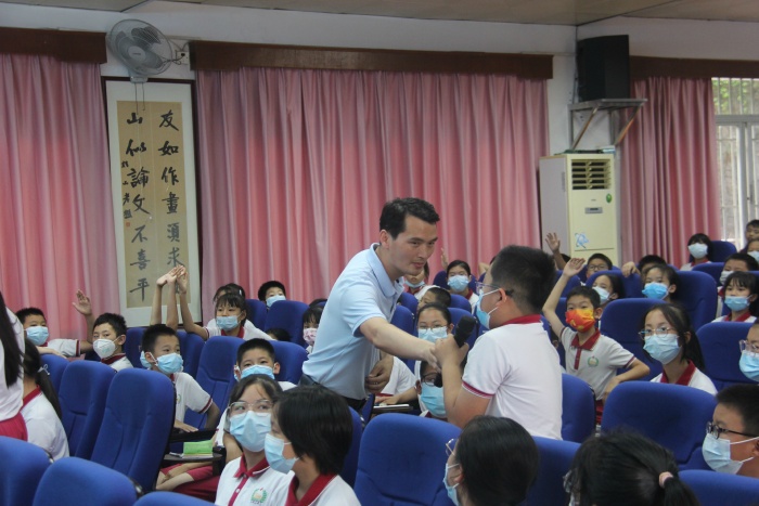 學(xué)生置身于綜合電教室內(nèi)聽蔡校長講思政課,全程都?xì)g呼雀躍地舉手發(fā)言,像在奔跑追光中的少年。直至最后,興高采烈地與蔡校長一起高聲總結(jié)——