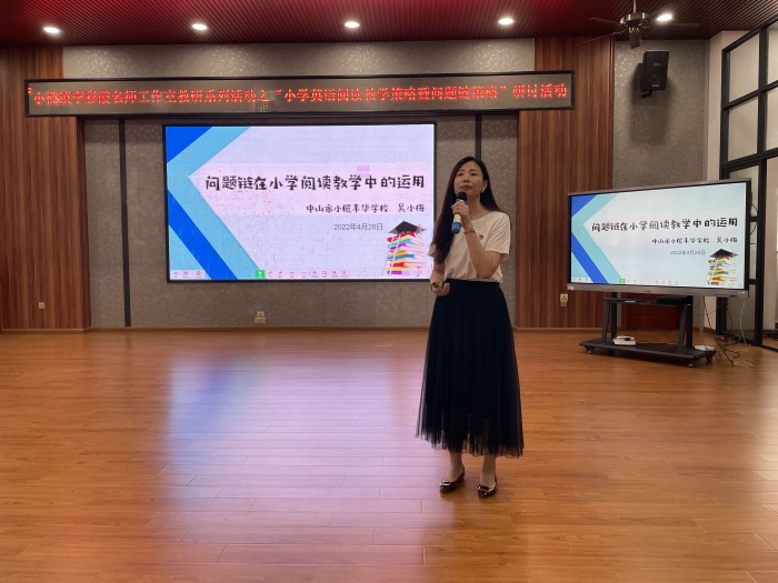 活動的第二部分是豐華學校的吳小梅主任就《小學英語閱讀教學中運用問題鏈策略提升學生思維能力》這一課題開展專題講座。吳主任以周黎老師的繪本課堂為例引領與會教師共同學習問題鏈在閱讀教學的運用,結合繪本閱讀課的不同環節應設計什么類型的問題鏈,基于教學目標、教學內容以及學情分析如何設計啟發學生思考的、提高學生思維品質的問題鏈。