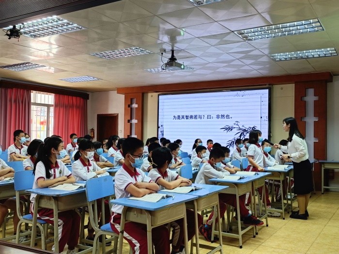 活動的第一環節是課堂展示。第一堂課是劉韻盈老師執教的《曉出凈慈寺送林子方》。劉老師以西湖美景作鋪墊,通過圖文結合引導學生理解“無窮”、“映日”等詞眼,領略西湖的意境美。同時,注重美讀詩文、以讀代講,降低古詩學習的難度。第二堂課是劉佳寧老師執教的文言文《學弈》,她以簡練的語言推進教學過程在讀、品、賞、悟中層層遞進,又巧妙引用歷史背景知識引領學生會其意,悟其情,從而理解學習需要專心致志的道理。