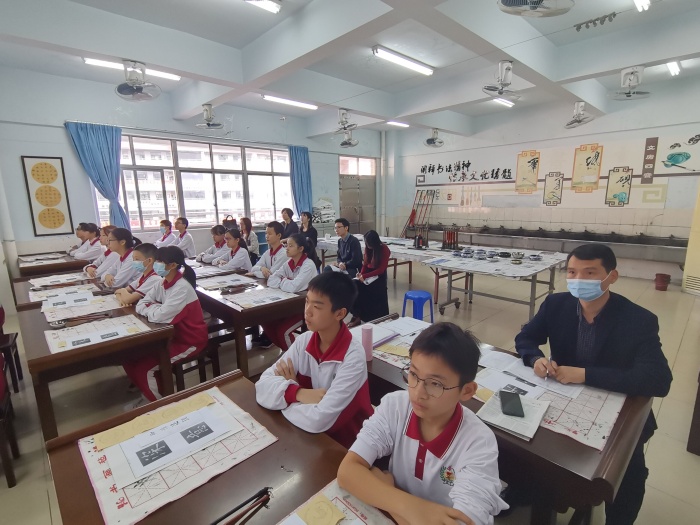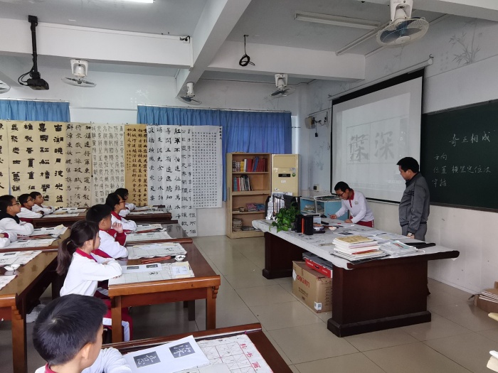 第一階段,首先由課題組成員李堆威老師進行書法課例展示——《奇正相成》,李老師由生活中的平衡圖片導入課題,再引導學生觀察“深”字的結構,相機總結軟筆書寫時要注意運筆方向、比劃位置以及部首之間穿插避讓的觀察方法。通過書法教育潛移默化地促進學生優秀的品性,滲透書法教育培育學生優秀品行的實施策略。