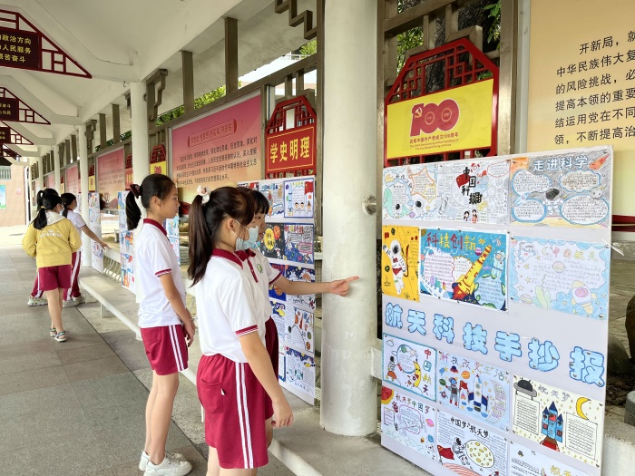 在各項科技活動的開展中,同學們都積極自主,放飛想象。在“科技小發明小制作”的活動中,一至六年級學生取靈感于生活,腦筋動一動,廢物即搖身一變成精致的航天模型、宇宙模型、機器人模型等。在“科學知識競賽”中,三至六年級派出的參賽代表都旗鼓相當,答題如龍爭虎斗。經過激烈的角逐,分別由三2班、四3班、五7班、六3班獲得知識競賽的特等獎。基于一、二年級學生的年齡特點,科學老師貼心地以“創意撕紙比賽”和“噴氣小車團體”取代難度較大的知識競賽,孩子們都超級喜歡!孩子們還超級喜歡科學老師精心挑選以“自然生命”為主題的“科普大電影”。無論是一年級的《藍色星球》,還是六年級的《流浪地球》,都旨在提高學生保護環境的意識,讓學生懂得愛護動植物與珍愛生命,加入保護地球行列。最吸引眼球的是以“神舟十三號航天員太空出差六個月,遠征星辰大海后返回地球”為主題的科學手抄報。展示長廊后,經過的老師與學生都不由自主地駐足觀看。