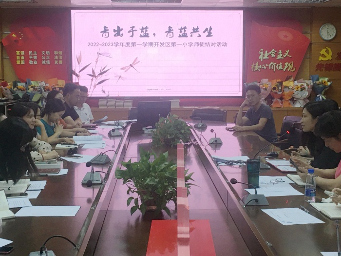 秋風(fēng)起兮白云飛。為引領(lǐng)新學(xué)年新教師正確把握學(xué)校辦學(xué)理念,學(xué)會(huì)有效構(gòu)建課堂及駕馭課堂,同時(shí)演繹好班主任角色,穩(wěn)妥管理班級(jí)事務(wù),在教學(xué)路上穩(wěn)步起飛,開發(fā)區(qū)第一小學(xué)于9月21日下午開展了2022-2023學(xué)年度第一學(xué)期“青出于藍(lán),青藍(lán)共生”師徒結(jié)對(duì)活動(dòng)。活動(dòng)由何思行副主任主持。蔡長青校長、康樂副校長、部分行政、各年級(jí)組長及各學(xué)科組長以及參加師徒結(jié)對(duì)的師父與徒弟出席了本次活動(dòng)。