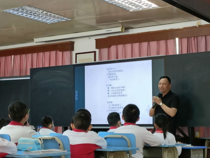 在這次活動中,文自成老師給老師們帶來了一節《繁星》的詩歌教學。課堂上,文老師化繁為簡,用質樸的語言、簡單的課件帶領四5班的孩子們領略《繁星》的特色,從橫向、縱向兩個思維角度讓學生在領略詩歌情感的同時感受詩歌語言特點,讓學生圍繞事、景、情三方面進行詩歌創作,引導學生發現詩歌中蘊藏的美。在文老師全方位的指導下,學生有感而發,現場創作詩歌佳作頻出,掌聲陣陣。整節課設計巧妙,詩意滿滿,是一節非常有指導性的示范課。