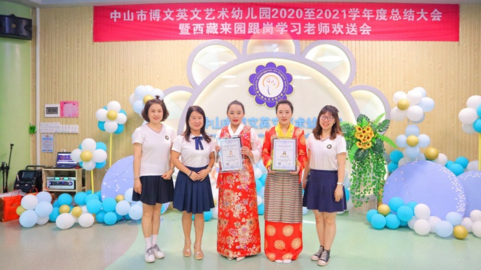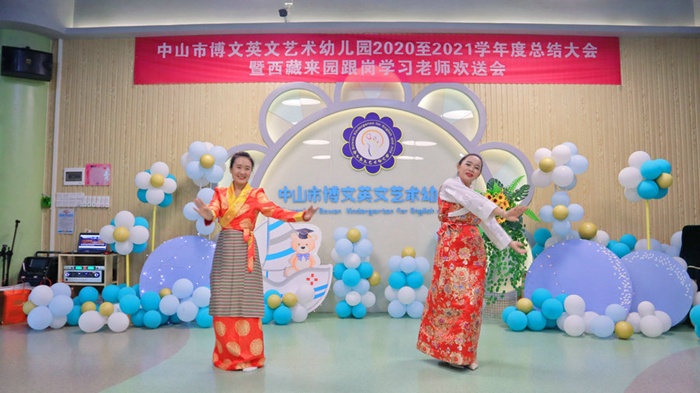 接著,幼兒園為兩位老師制定出具體詳細的跟崗學習方案,對學習內容和人員進行了細致安排,讓她們能和本園老師一視同仁地參與到日常各項教育教研活動中,毫無保留地傳遞分享幼教資訊,促進共同進步。兩位西藏老師積極投入各班教育教學活動中,感受自主、快樂、充滿人文關懷的教育氛圍;觀摩衛生保健、清潔消毒、營養膳食和安全等方面的精細化管理工作;觀摩英語、體藝特色課2021年7月2日,學期結束之際,中山市博文英文藝術幼兒園組織全體教職工為迪花和扎西措姆兩位西藏老師舉辦了別開生面的歡送會。歡送會上,老師們載歌載舞互相交流,盧艷青園長還回顧了幼兒園在接待跟崗學習工作中的點點滴滴,指出了粵藏兩地幼教交流與融合的重要意義,并對兩位老師幾個月來在幼兒園虛心認真的跟崗學習態度表示了充分的肯定。迪花和扎西措姆老師分別發表了跟崗學習感言,表示跟崗學習安排充實,來有所學,學有所獲;并對幼兒園在生活、學習、工作上給予的無微不至的關懷和照顧表示感謝,表示跟崗結束后,會把在這里學習到的先進的教育理念和方法傳播回去,運用到實際的工作中。