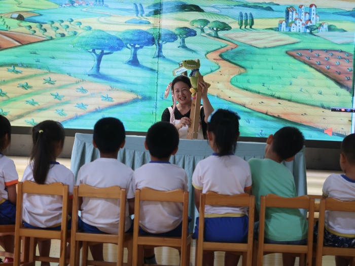 王萍書記以繪本故事《鱷魚愛上長頸鹿》為藍本,沿用了開發區第一幼兒園戲劇教育特色課程,親自原創戲劇活動《鱷魚愛上長頸鹿》,通過熱身游戲、手偶講故事、小組表演等戲劇策略與方法,讓幼兒了解了故事內容、掌握了鱷魚與長頸鹿的外形特征,并通過肢體演繹,大膽表現與表征鱷魚與長頸鹿的形象特點,積極調動思維、發揮想象力,幫助鱷魚想辦法,與長頸鹿交朋友。